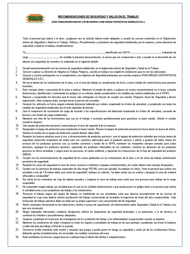 (PARA TRABAJADORES NUEVOS O DE RE-INGRESO A RCM VARGAS CONTRATISTAS GENERALES S.R.L.)