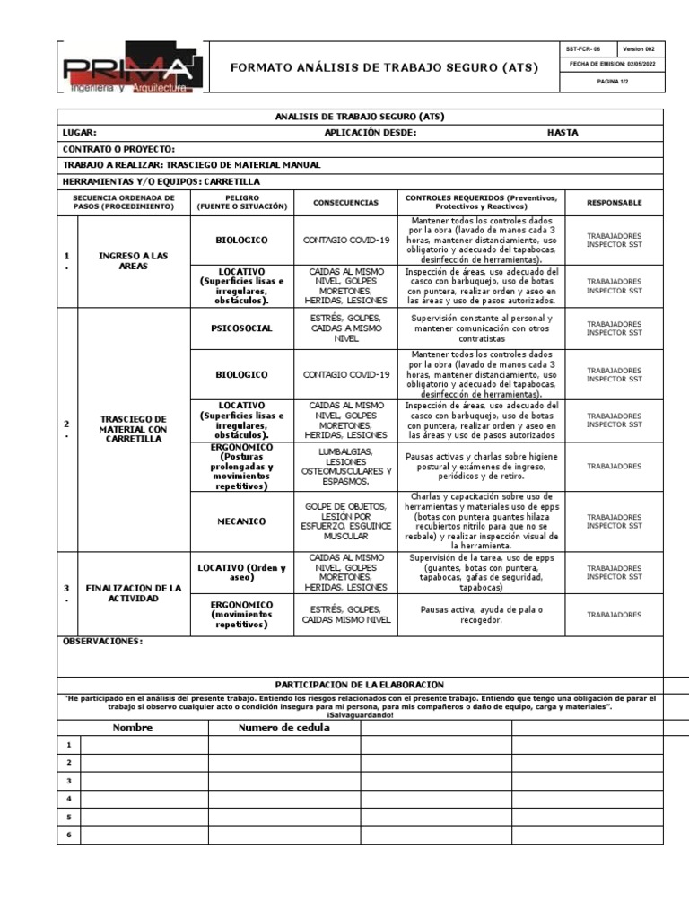 FORMATO ANÁLISIS DE TRABAJO SEGURO (ATS) FECHA DE EMISION: 02/05/2022