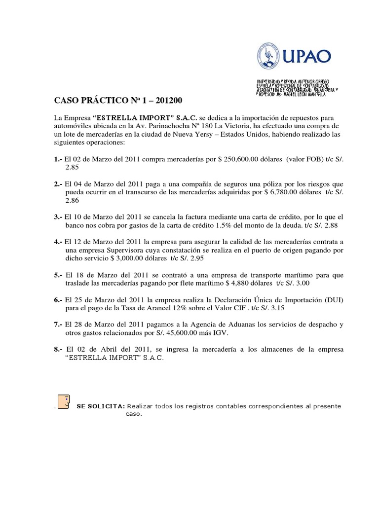 1.- El 02 de Marzo del 2011 compra mercaderías por $ 250,600.00 dólares (valor FOB) t/c S/.