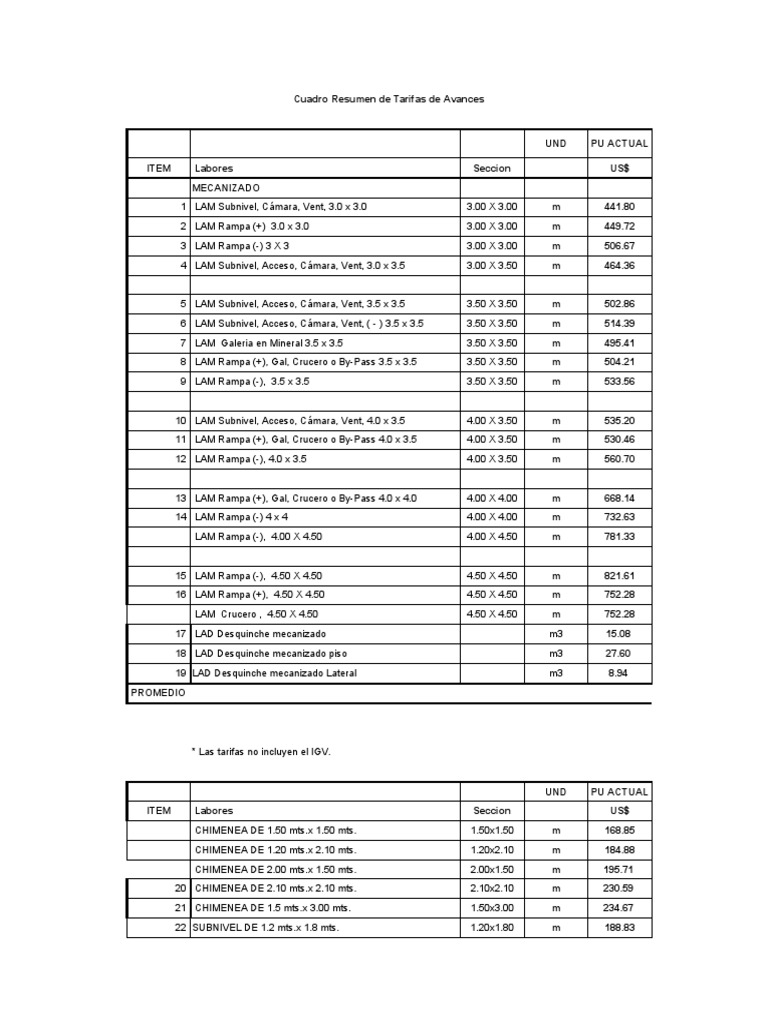Labores a h Equipo PU (US$/m) Costo (US$)