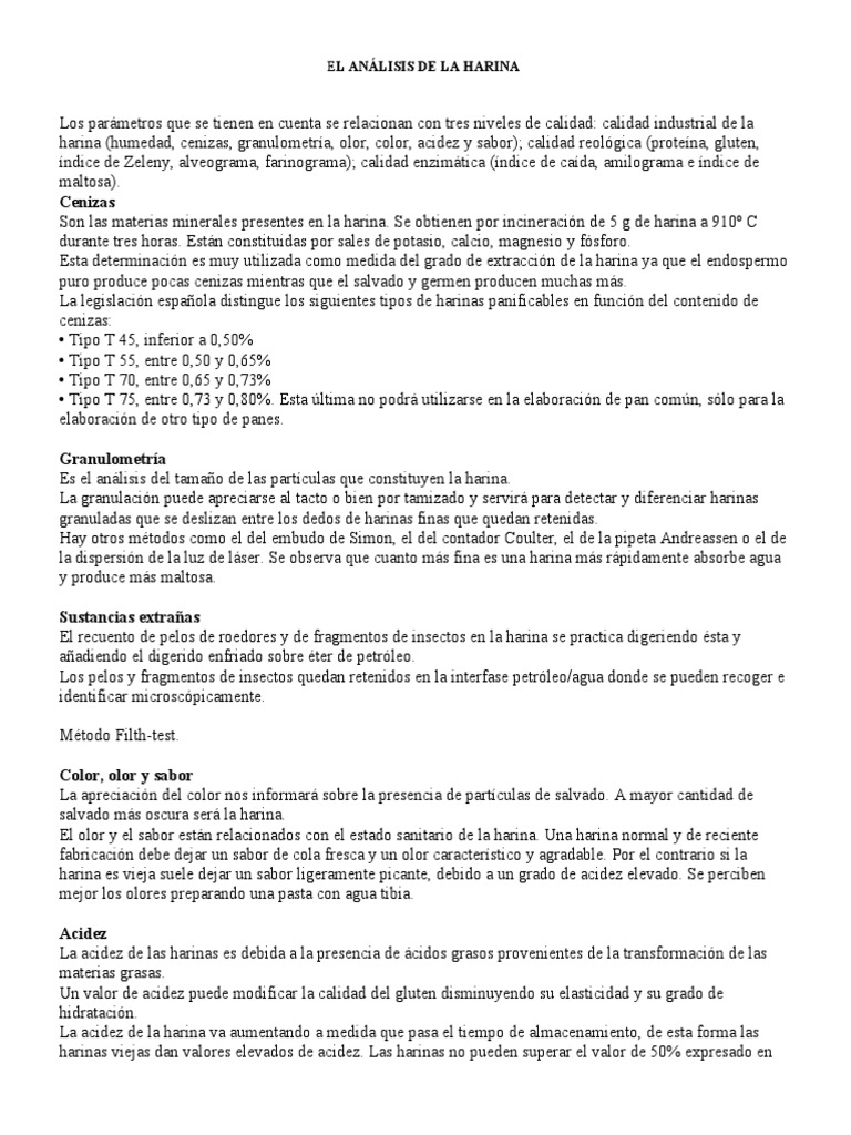 harina (humedad, cenizas, granulometría, olor, color, acidez y sabor); calidad reológica (proteína, gluten,