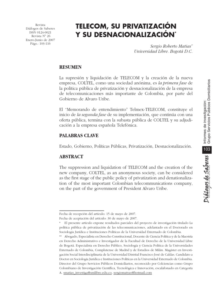 MATIAS, Sergio Roberto. Políticas Públicas y telecomunicaciones en Colombia. Diálogos
