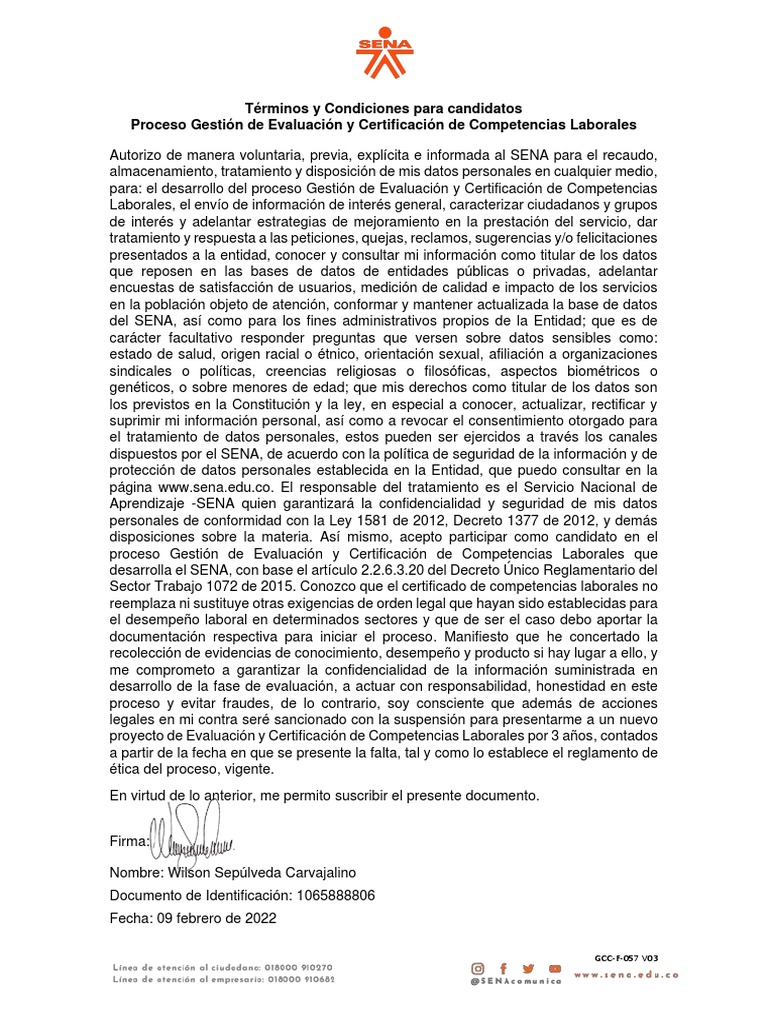 página www.sena.edu.co. El responsable del tratamiento es el Servicio Nacional de
