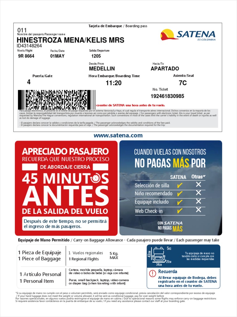 Al llevar equipaje de Bodega, debes registrarlo en el counter de SATENA una hora antes de tu vuelo.