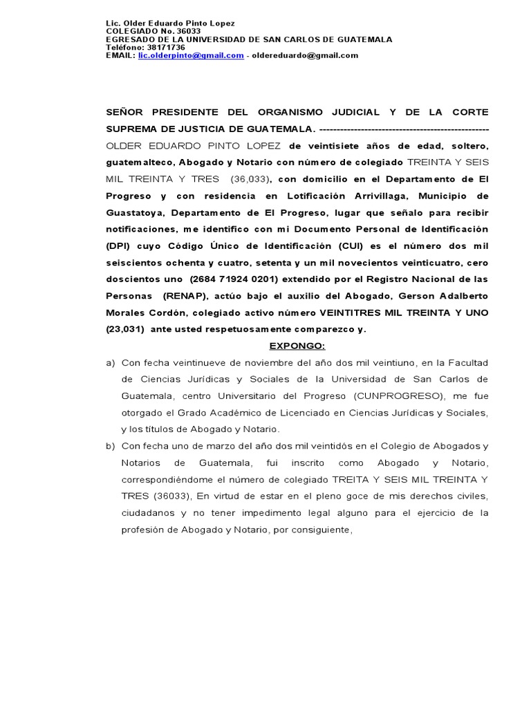 guatemalteco, Abogado y Notario con número de colegiado TREINTA Y SEIS