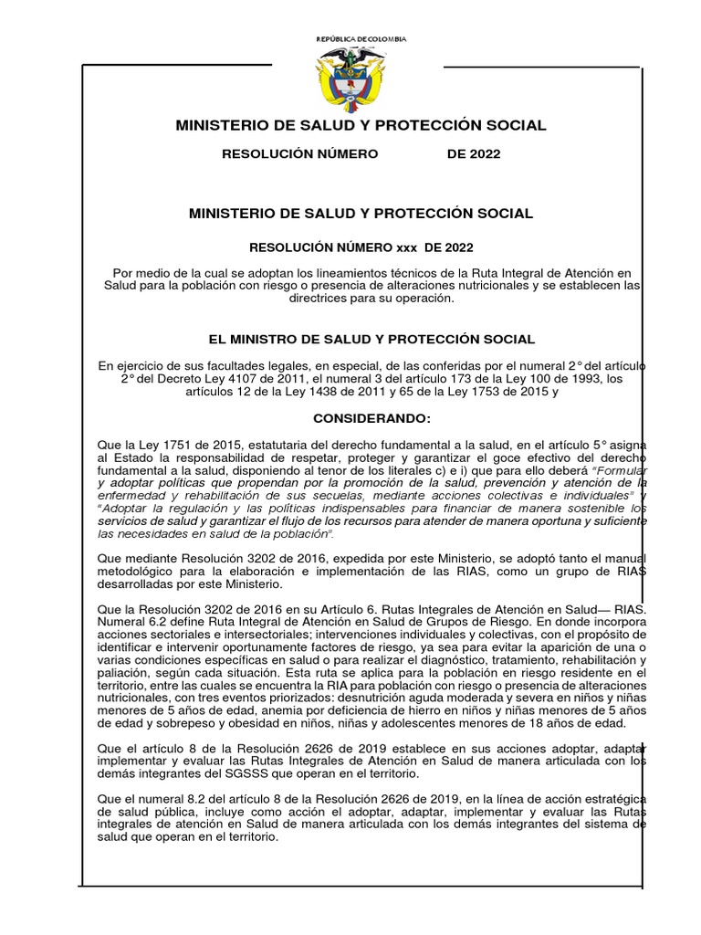 Atención en Salud para la población con riesgo o presencia de alteraciones nutricionales y se establecen las directrices