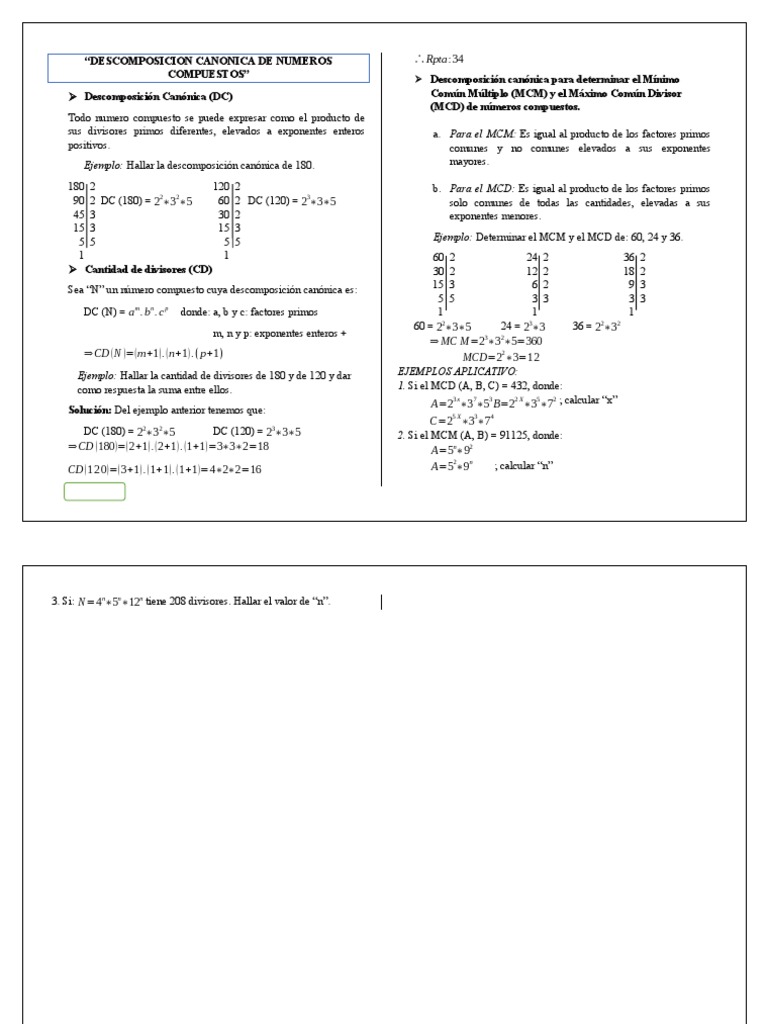 “DESCOMPOSICION CANONICA DE NUMEROS ∴ Rpta :34