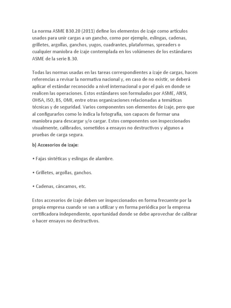 técnicas y de seguridad. Varios componentes son elementos de izaje, pero que