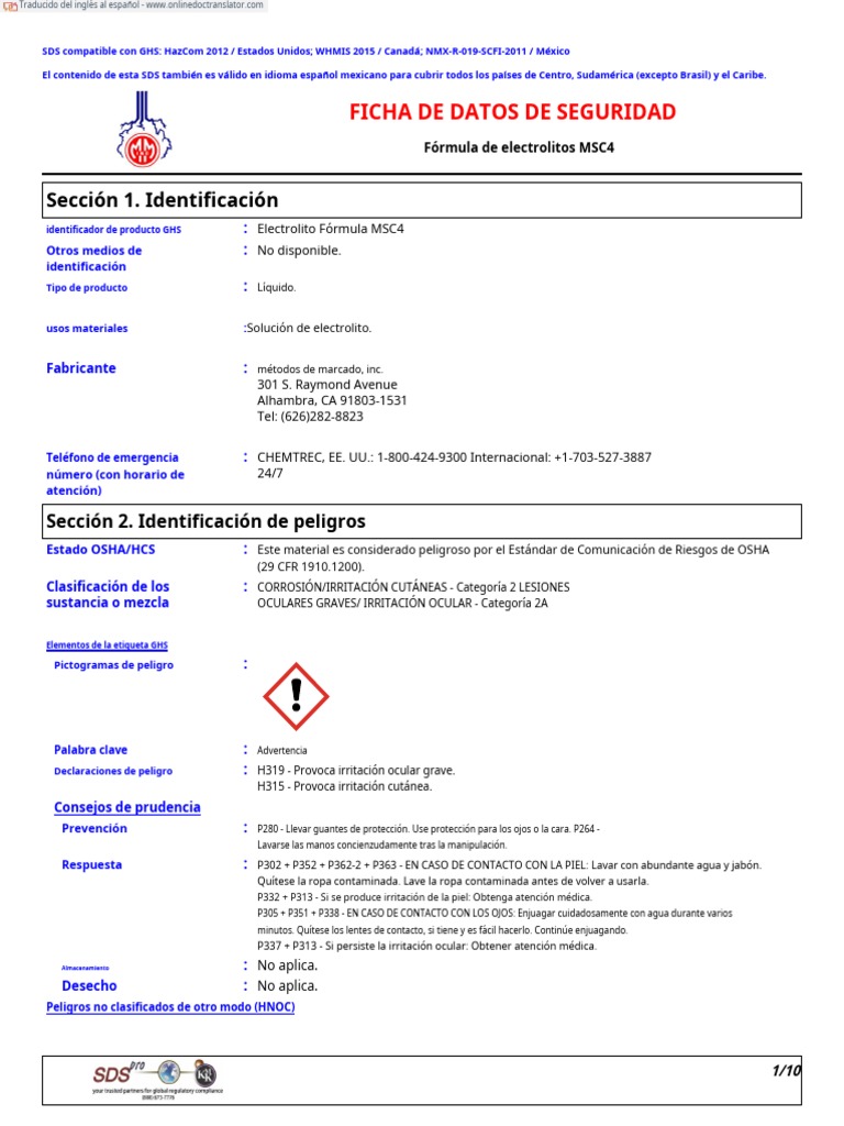 identificador de producto GHS : Electrolito Fórmula MSC4