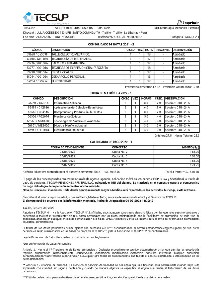 Suscribe el alumno mayor de edad, o por su Padre, Madre o Tutor, en caso de menores de edad, y el Director de TECSUP.