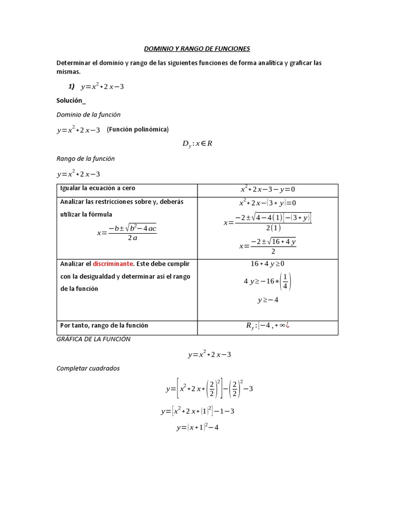 Determinar el dominio y rango de las siguientes funciones de forma analítica y graficar las