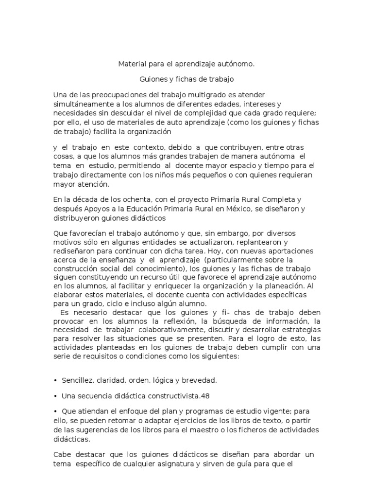 Guiones y fichas de trabajo Una de las preocupaciones del trabajo multigrado es atender simultneamente a los alumnos de diferentes edades, intereses y necesidades sin descuidar el nivel de complejidad que cada grado requiere; por ello, el uso de materiales de auto aprendizaje (como los guiones y fichas de trabajo) facilita la organizacin y el trabajo en este contexto, debido a que contribuyen, entre otras cosas, a que los alumnos ms grandes trabajen de manera autnoma el tema en estudio, permitiendo al docente mayor espacio y tiempo para el trabajo directamente con los nios ms pequeos o con quienes requieran mayor atencin. En la dcada de los ochenta, con el proyecto Primaria Rural Completa y despus Apoyos a la Educacin Primaria Rural en Mxico, se disearon y distribuyeron guiones didcticos Que favorecan el trabajo autnomo y que, sin embargo, por diversos motivos slo en algunas entidades se actualizaron, replantearon y redisearon para continuar con dicha tarea. Hoy, con nuevas aportaciones acerca de la enseanza y el aprendizaje (particularmente sobre la construccin social del conocimiento), los guiones y las fichas de trabajo siguen constituyendo un recurso til que favorece el aprendizaje autnomo en los alumnos, al facilitar y enriquecer la organizacin y la planeacin. Al elaborar estos materiales, el docente cuenta con actividades especficas para un grado, ciclo e incluso algn alumno. Es necesario destacar que los guiones y fi- chas de trabajo deben provocar en los alumnos la reflexin, la bsqueda de informacin, la necesidad de trabajar colaborativamente, discutir y desarrollar estrategias para resolver las situaciones que se presenten. Para el logro de esto, las actividades planteadas en los guiones de trabajo deben cumplir con una serie de requisitos o condiciones como los siguientes: Sencillez, claridad, orden, lgica y brevedad. Una secuencia didctica constructivista.48 Que atiendan el enfoque del plan y programas de estudio vigente; para ello, se pueden retomar o adaptar ejercicios de los libros de texto, o partir de las sugerencias de los libros para el maestro o los ficheros de actividades didcticas. Cabe destacar que los guiones didcticos se disean para abordar un tema especfico de cualquier asignatura y sirven de gua para que el