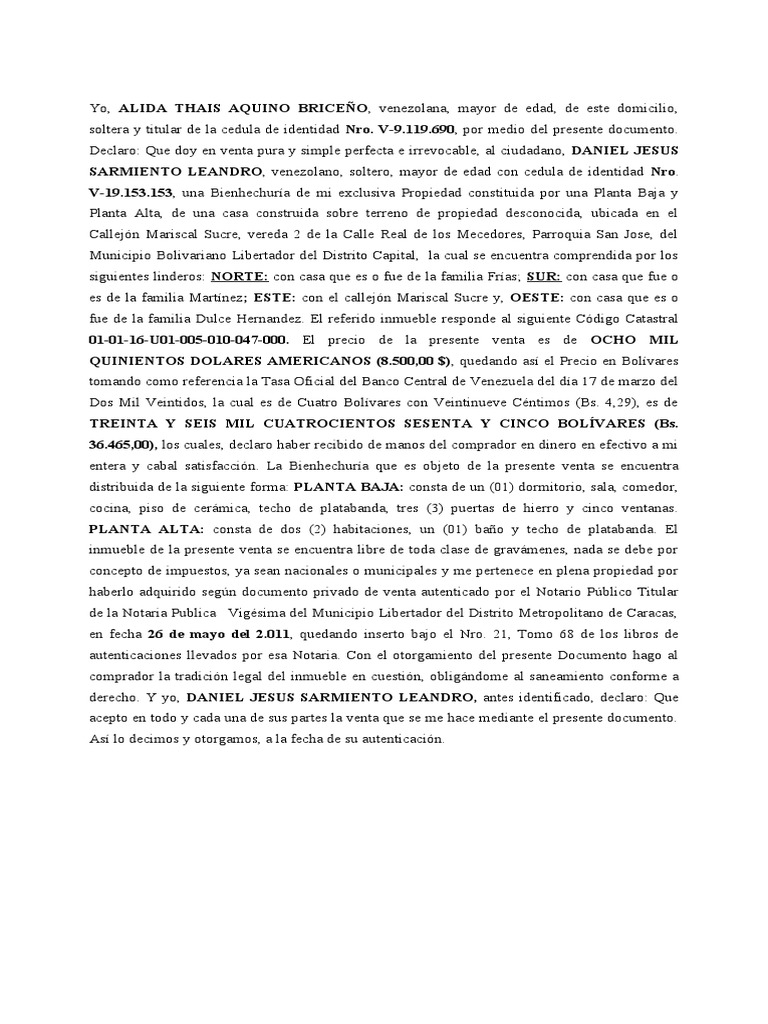Yo, ALIDA THAIS AQUINO BRICEÑO, venezolana, mayor de edad, de este domicilio,