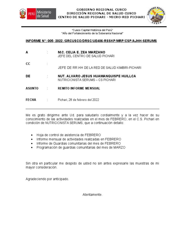 INFORME N°: 005- 2022 /GRCUSCO/DRSC/UE406-RSSKP/MRP/CSP/AJHH-SERUMS