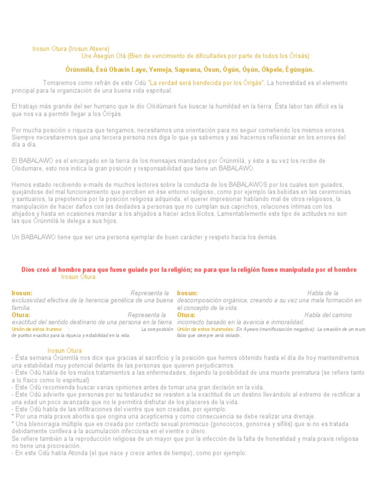 Irosun: En Ure (manifestación positiva): Representa la Irosun: En Ayewo (manifestación negativa): Habla de la