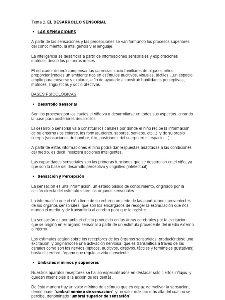 EL DESARROLLO SENSORIAL LAS SENSACIONES A partir de las sensaciones y las percepciones se van formando los procesos superiores del conocimiento, la inteligencia y el lenguaje. La inteligencia se desarrolla a partir de informaciones sensoriales y exploraciones motrices desde los primeros meses. El educador deber compensar las carencias socio-familiares de algunos nios proporcionndoles un ambiente rico en estmulos auditivos, visuales, tctiles...,un espacio amplio para moverse y explorar, a fin de ayudarle a construir habilidades perceptivas, motrices, lingsticas y socio-afectivas. BASES PSICOLGICAS Desarrollo Sensorial Son los procesos por los cuales el nio va a desarrollarse en todos sus aspectos, creando la base para posteriores desarrollos. El desarrollo sensorial va a constituir los canales por donde el nio recibe la informacin de su entorno (los colores, las formas, olores, sabores, sonidos, etc...), y de su propio cuerpo (sensaciones de hambre, fro, posiciones del cuerpo en el espacio....) A partir de estas informaciones el nio podr dar respuestas adaptadas a las condiciones del medio, es decir, realizar acciones inteligentes. Las capacidades sensoriales son las primeras funciones que se desarrollan en el nio, ya que son la base del desarrollo perceptivo y cognitivo (intelectual) Sensacin y Percepcin La sensacin es una informacin, un estado bsico de conocimiento, originado por la accin directa del estmulo sobre los rganos sensoriales. La informacin que el nio tiene de su entorno procede de las aportaciones provenientes de los rganos sensoriales, que son los encargados de recoger la estimulacin que nos manda el medio, y de transmitirla al cerebro para que la registre. La sensacin es por tanto el efecto producido en las reas cerebrales por la excitacin que se origin en el rgano sensorial a partir de un estmulo procedente del medio externo o interno. Los estmulos actan sobre los receptores de los rganos sensoriales, producindose una excitacin, y originndose una activacin nerviosa, que es transmitida a travs de los canales como son los nervios (pticos, auditivos, olfativos, tctiles y terminales gustativas) hasta el cerebro, rgano que regula la vida consciente. Umbrales mnimos y superiores Nuestros aparatos receptores se hallan especializados en destacar slo ciertos influjos, y quedan insensibles a la accin de los dems. De sta manera hay un valor mnimo de estmulo que es capaz de motivar la sensacin, denominado umbral mnimo de sensacin, y un valor mximo ms all del cual no se percibe, denominado umbral superior de sensacin.