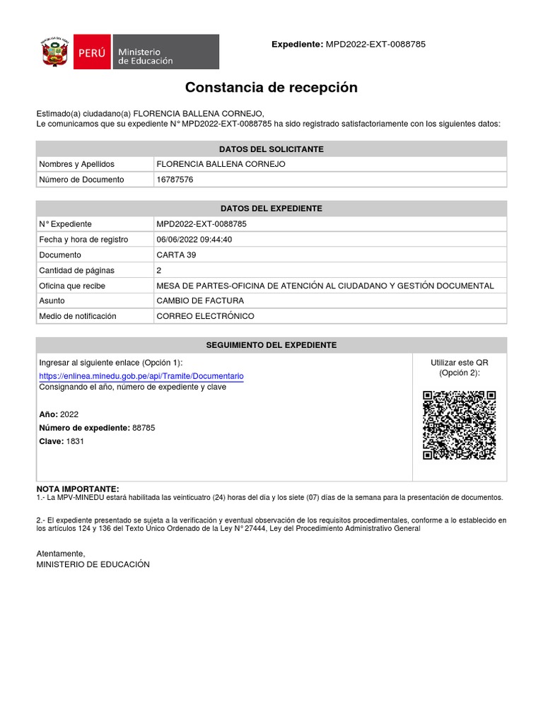 Le comunicamos que su expediente N° MPD2022-EXT-0088785 ha sido registrado satisfactoriamente con los siguientes datos: