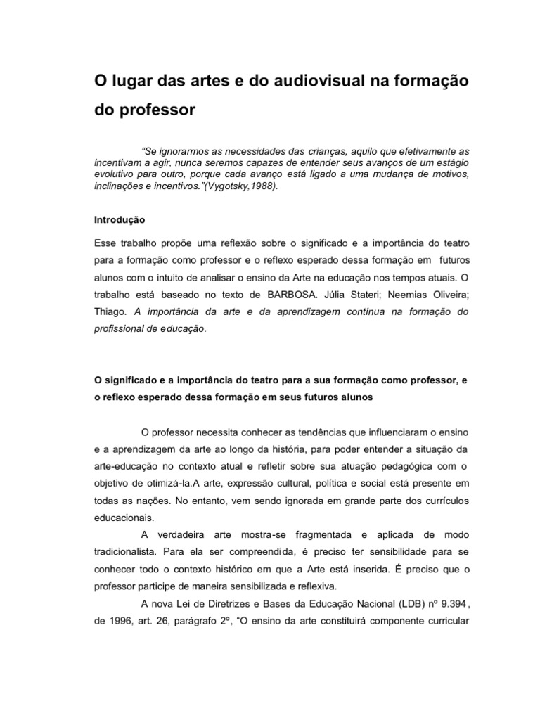 Esse trabalho prope uma reflexo sobre o significado e a importncia do teatro para a formao como professor e o reflexo esperado dessa formao em futuros alunos com o intuito de analisar o ensino da Arte na educao nos tempos atuais. O trabalho est baseado no texto de BARBOSA. Jlia Stateri; Neemias Oliveira; Thiago. A importncia da arte e da aprendizagem contnua na formao do profissional de educao.