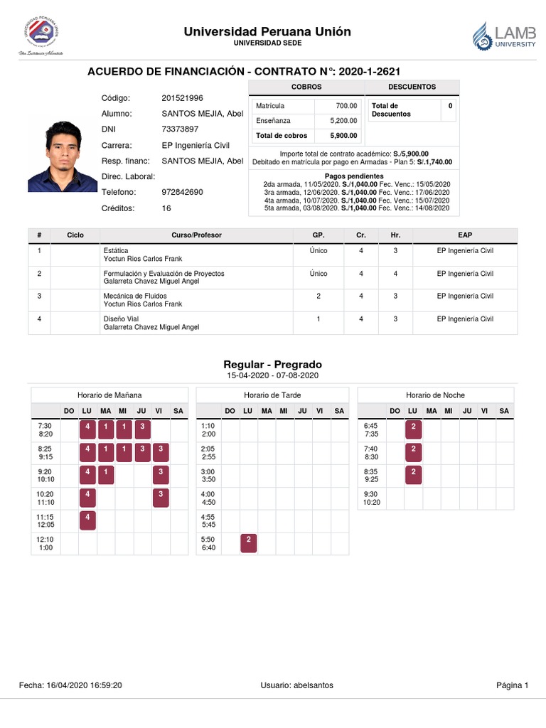 ACUERDO DE FINANCIACION-CONTRATO N° 2020-1-2621 con su respectivo fraccionamiento en cuotas durante el ciclo, más el concepto de matrícula, tal