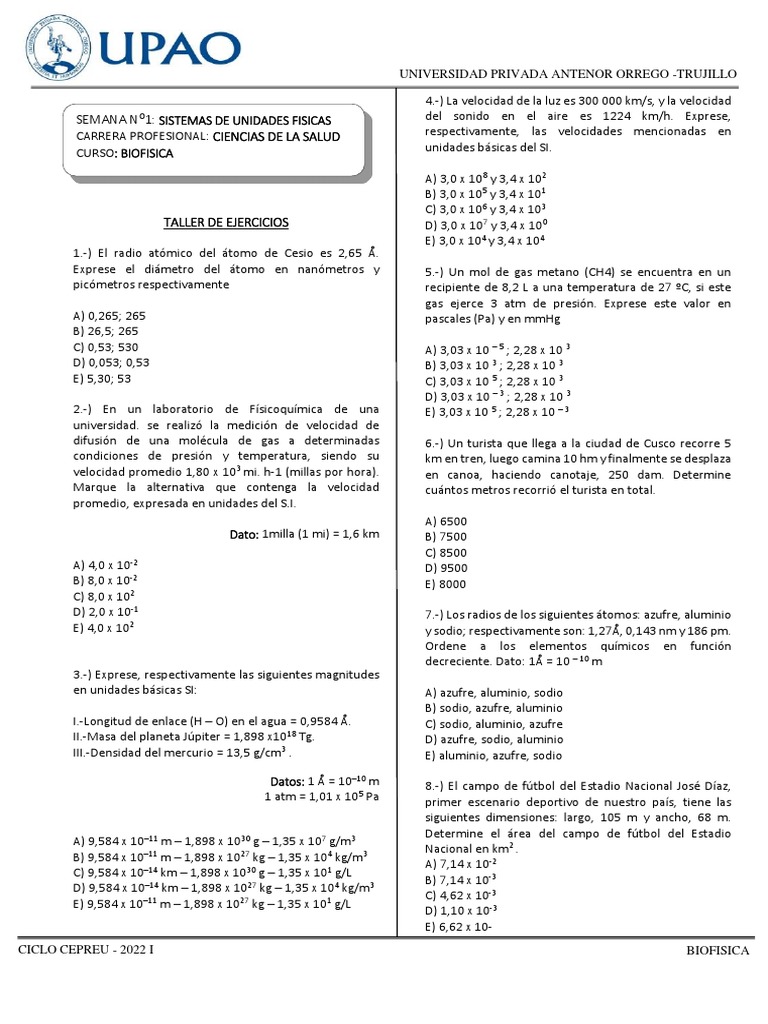 Taller de Biofísica: Ejercicios de Unidades SI