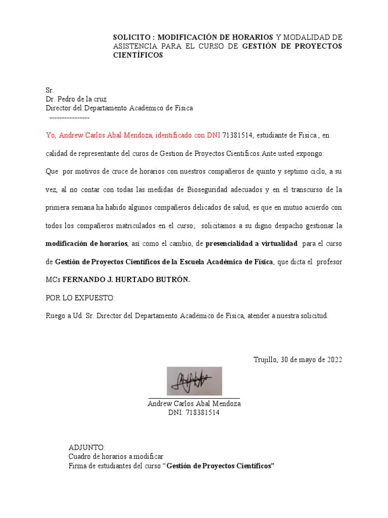 Ruego a Ud. Sr. Director del Departamento Académico de Física, atender a nuestra solicitud.