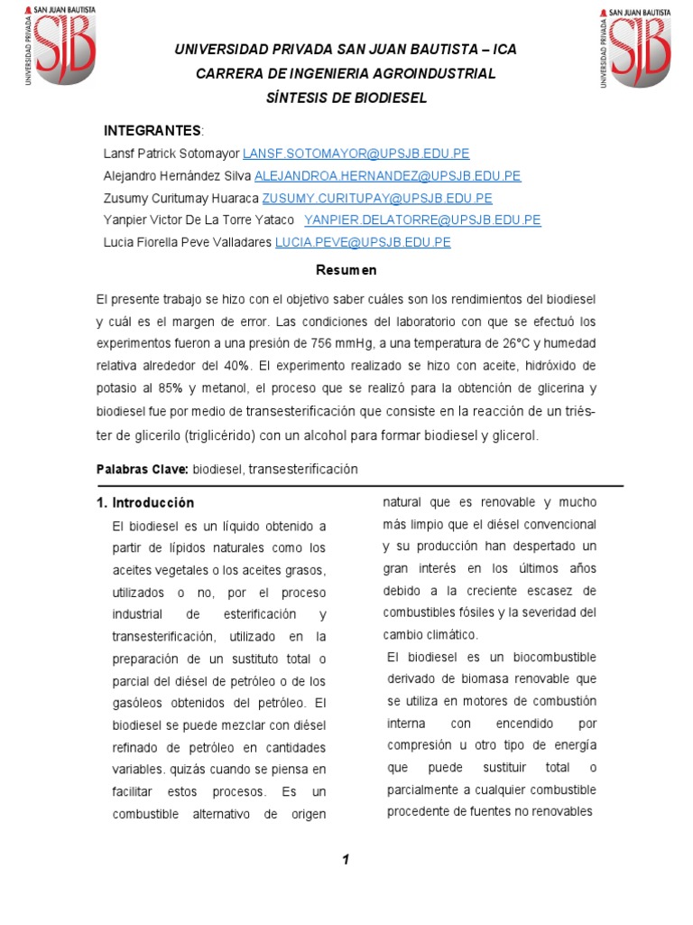 El presente trabajo se hizo con el objetivo saber cuáles son los rendimientos del biodiesel