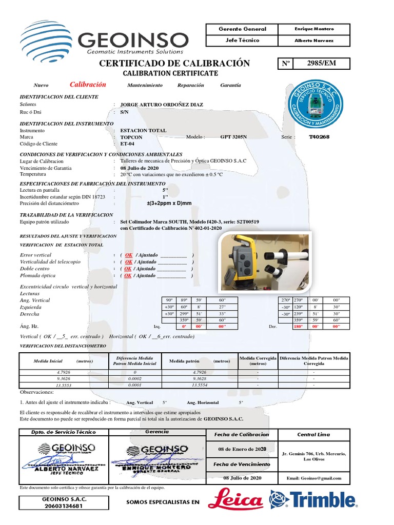 Lugar de Calibracion : Talleres de mecanica de Precisión y Óptica GEOINSO S.A.C