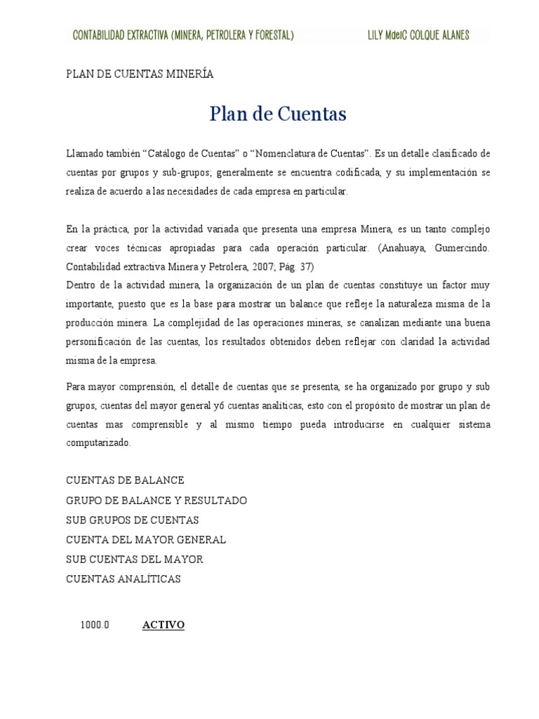 Dentro de la actividad minera, la organización de un plan de cuentas constituye un factor muy