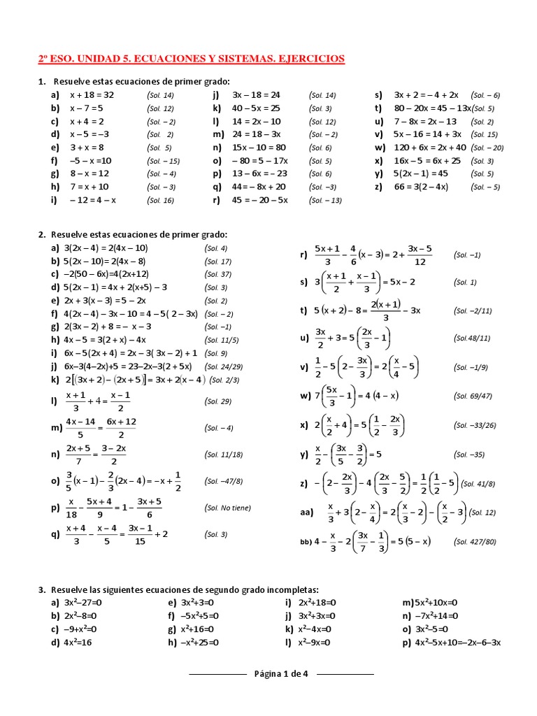 a) x + 18 = 32 (Sol. 14) j) 3x – 18 = 24 (Sol. 14) s) 3x + 2 = – 4 + 2x (Sol. – 6)