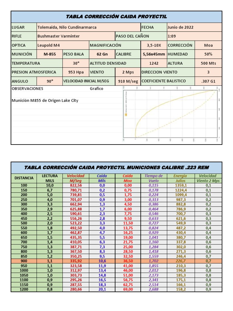 TABLA CORRECCIÓN CAIDA PROYECTIL MUNICIONES CALIBRE .223 REM