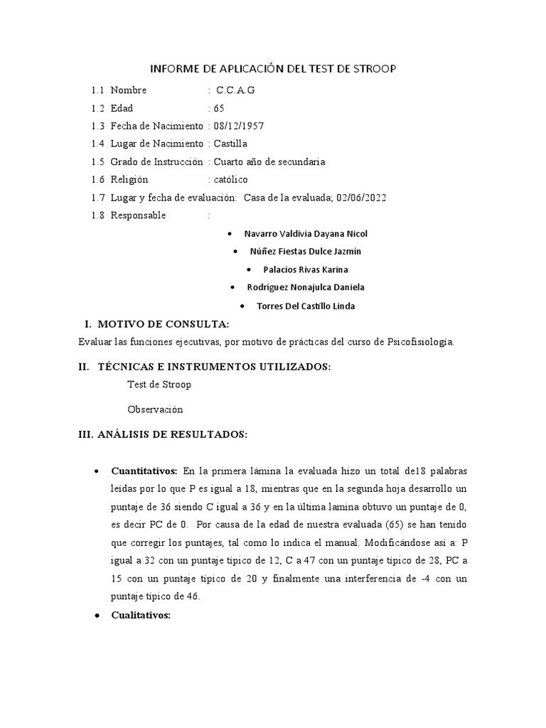 INFORME DE APLICACIÓN DEL TEST DE STROOP