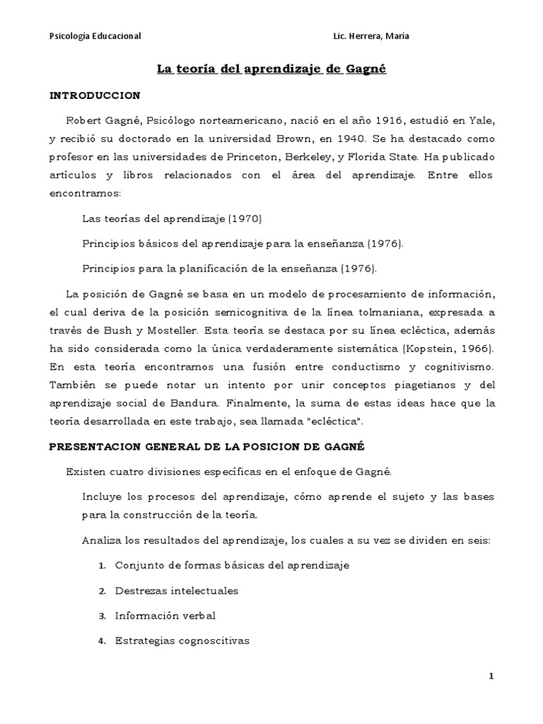 Gagné nos señala cinco resultados o dominios del aprendizaje, que pueden