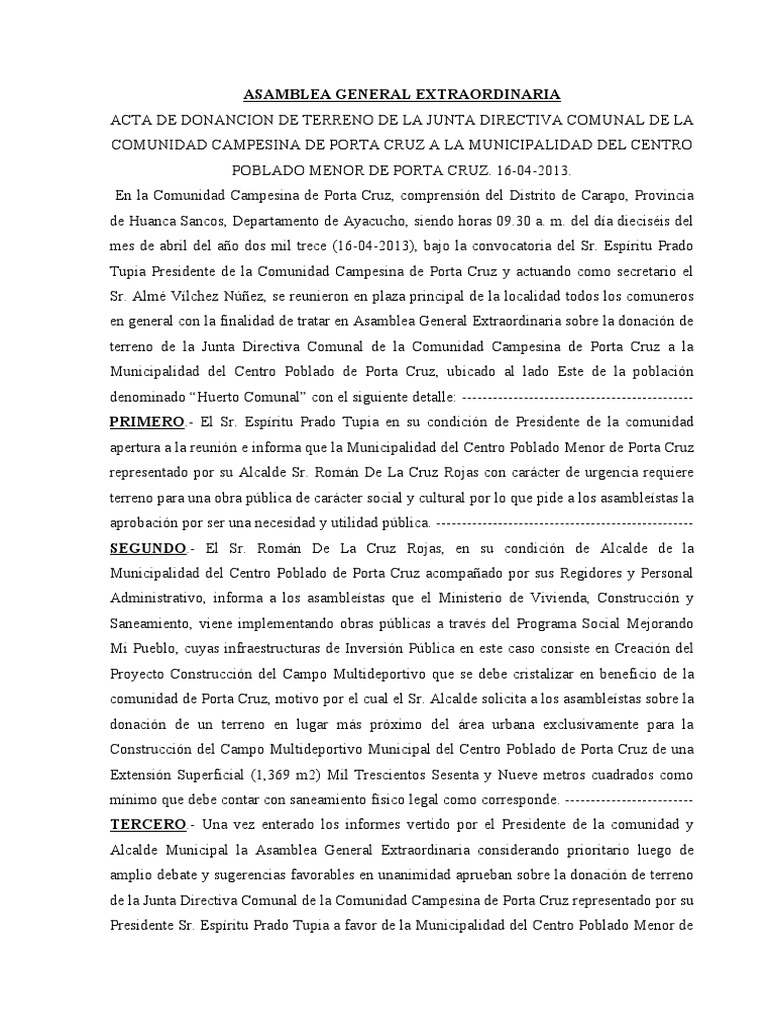 Tupia Presidente de la Comunidad Campesina de Porta Cruz y actuando como secretario el