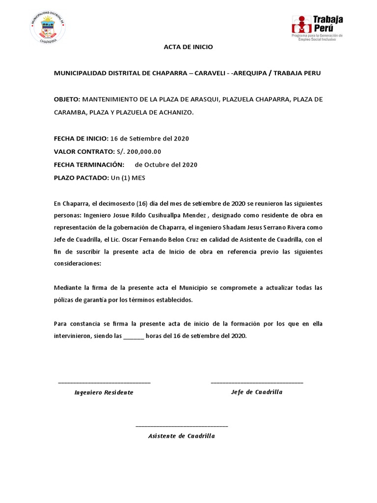MUNICIPALIDAD DISTRITAL DE CHAPARRA – CARAVELI - -AREQUIPA / TRABAJA PERU