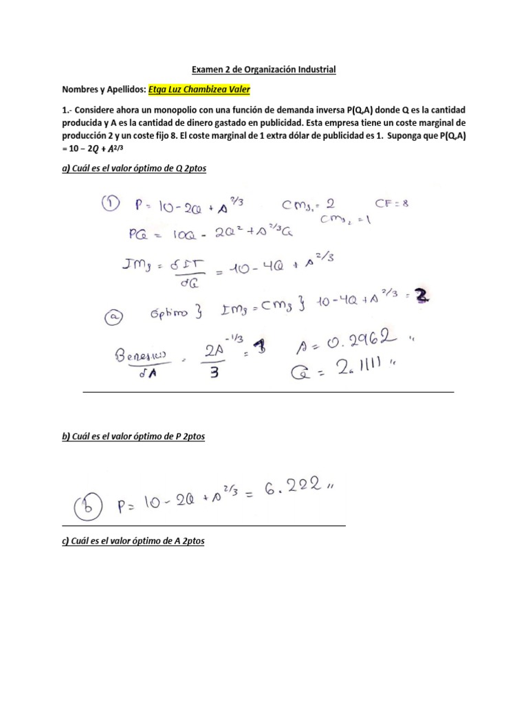 1.- Considere ahora un monopolio con una función de demanda inversa P(Q,A) donde Q es la cantidad