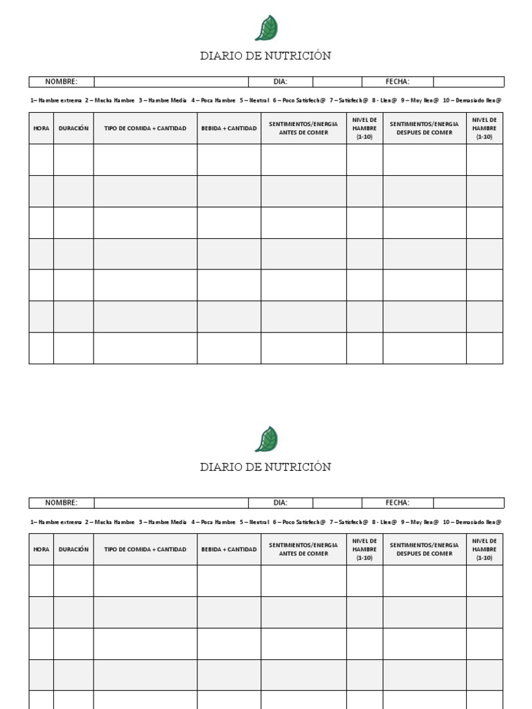 1– Hambre extrema 2 – Mucha Hambre 3 – Hambre Media 4 – Poca Hambre 5 – Neutral 6 – Poco Satisfech@ 7 – Satisfech@ 8 - Llen@ 9 – Muy llen@ 10 – Demasiado llen@