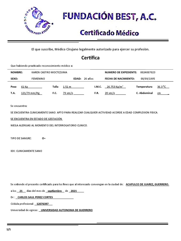SEXO: FEMENINO EDAD: 26 años FECHA DE NACIMIENTO: 08/09/1995
