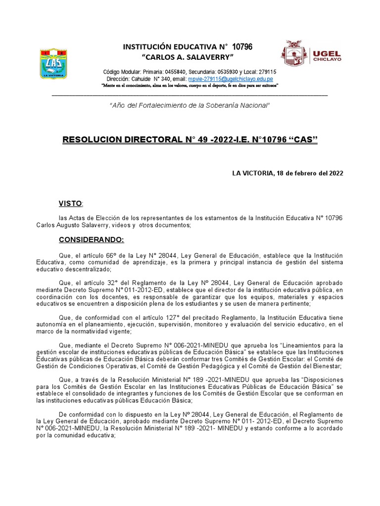 RESOLUCION DIRECTORAL N° 49 -2022-I.E. N°10796 “CAS”