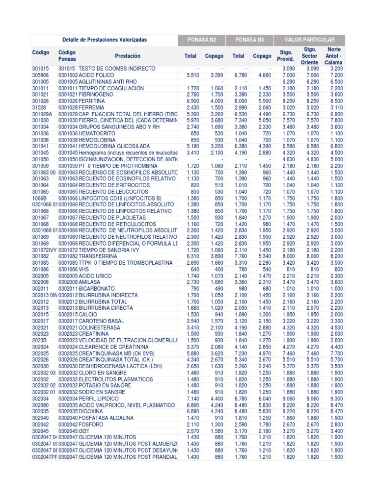 Detalle de Prestaciones Valorizadas FONASA N2 FONASA N3 VALOR PARTICULAR