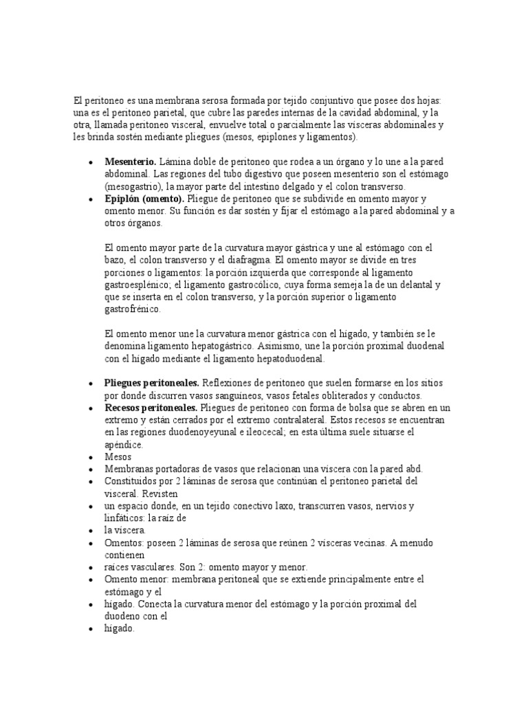 El peritoneo es una membrana serosa formada por tejido conjuntivo que posee dos hojas: