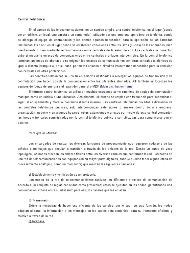 una caseta o un contenedor), utilizado por una empresa operadora de telefona, donde se alberga el equipo de conmutacin y los dems equipos necesarios, para la operacin de las llamadas telefnicas. Es decir, es el lugar donde se establecen conexiones entre los lazos (bucles) de los abonados, bien directamente o bien mediante retransmisiones entre centrales de la seal de voz. Las centrales se conectan entre s mediante enlaces de comunicaciones entre centrales o enlaces intercentrales. En la central telefnica terminan las lneas de abonado y se originan los enlaces de comunicaciones con otras centrales telefnicas de igual o distinta jerarqua o, en su caso, parten los enlaces o circuitos interurbanos necesarios para la conexin con centrales de otras poblaciones. Las centrales telefnicas se ubican en edificios destinados a albergar los equipos de transmisin y de conmutacin que hacen posible la comunicacin entre los diferentes abonados. All tambin se localizan los equipos de fuerza de energa y el repartidor general o MDF (Main distribution frame) El trmino central telefnica se utiliza en muchas ocasiones como sinnimo de equipo de conmutacin ms que como un edificio o una ubicacin. Actualmente, el trmino se emplea con frecuencia para denominar el lugar, el equipamiento y material contenido (Planta interna). Las centrales telefnicas privadas a diferencia de las centrales telefnicas pblicas, solo intercomunican extensiones o anexos dentro de una empresa, organizacin, negocio y en algunos hogares, estas extensiones o anexos por medio de esta central comparten las lneas o troncales suministradas por la central telefnica publica y son utilizadas para comunicarse con el exterior. Para qu se utilizan: Los encargados de realizar las diversas funciones de procesamiento que requieren cada una de las seales o mensajes que circulan o transitan a travs de los enlaces de la red. Desde un punto de vista topolgico, los nodos proveen los enlaces fsicos entre los diversos canales que conforman la red. Los nodos de una red de telecomunicaciones son equipos (en su mayor parte digitales, aunque pueden tener alguna etapa de procesamiento analgico, como un modulador) que realizan las siguientes funciones: a) Establecimiento y verificacin de un protocolo. Los nodos de la red de telecomunicaciones realizan los diferentes procesos de comunicacin de acuerdo a un conjunto de reglas conocidas como protocolos; stos se ejecutan en los nodos, garantizando una comunicacin exitosa entre s, utilizando para ello, los canales que los enlazan. b) Transmisin. Existe la necesidad de hacer uso eficiente de los canales, por lo cual, en esta funcin, los nodos adaptan al canal, la informacin o los mensajes en los cuales est contenida, para su transporte eficiente y efectivo a travs de la red. c) Interfase.