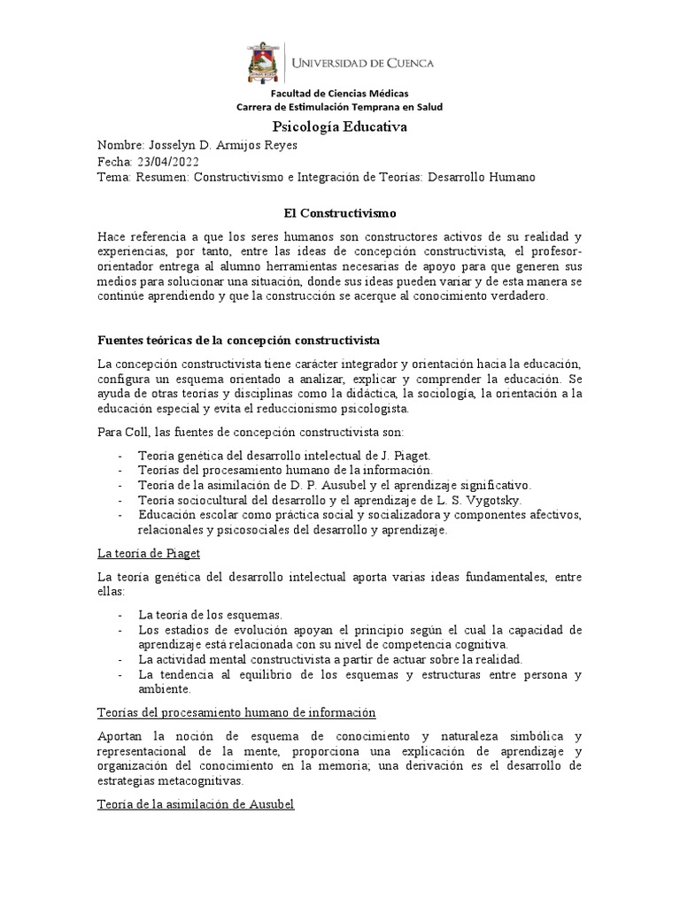 Tema: Resumen: Constructivismo e Integración de Teorías: Desarrollo Humano