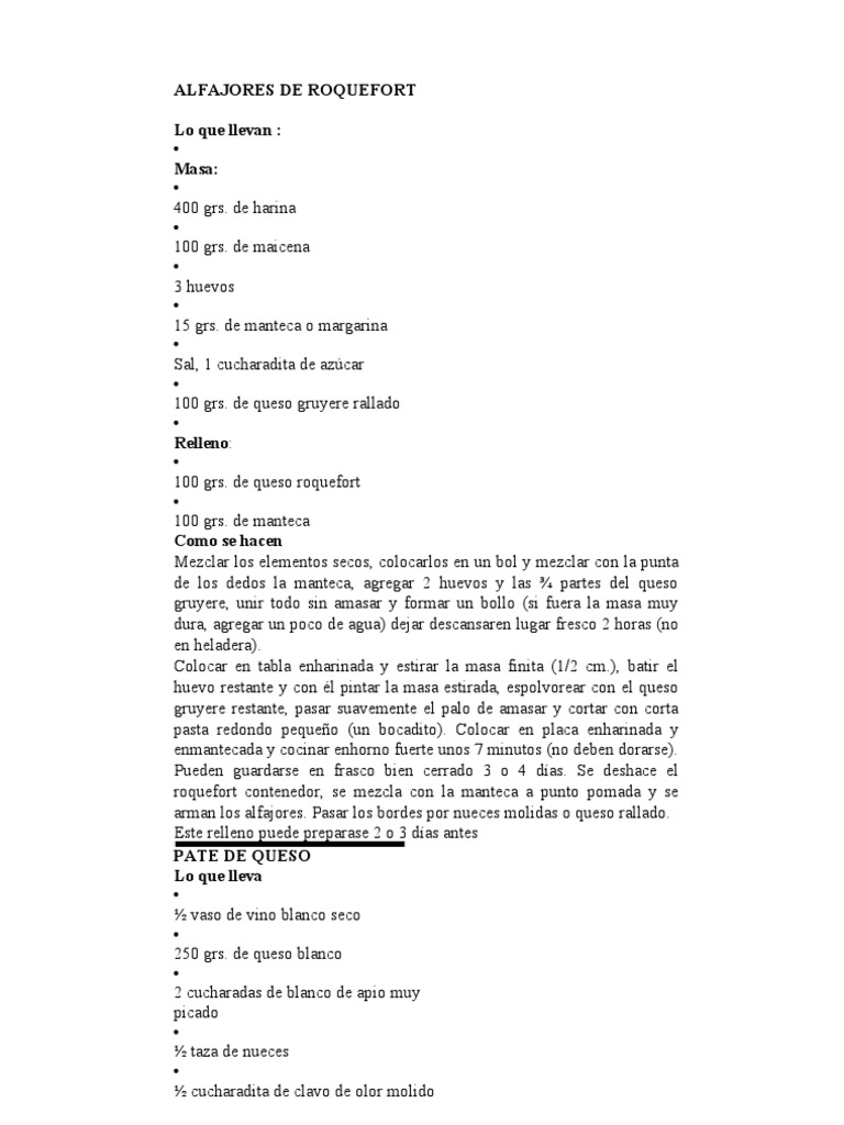 grs. de manteca o margarina Sal, 1 cucharadita de azcar 100 grs. de queso gruyere rallado Relleno: 100 grs. de queso roquefort 100 grs. de manteca Como se hacen Mezclar los elementos secos, colocarlos en un bol y mezclar con la punta de los dedos la manteca, agregar 2 huevos y las partes del queso gruyere, unir todo sin amasar y formar un bollo (si fuera la masa muy dura, agregar un poco de agua) dejar descansaren lugar fresco 2 horas (no en heladera). Colocar en tabla enharinada y estirar la masa finita (1/2 cm.), batir el huevo restante y con l pintar la masa estirada, espolvorear con el queso gruyere restante, pasar suavemente el palo de amasar y cortar con corta pasta redondo pequeo (un bocadito). Colocar en placa enharinada y enmantecada y cocinar enhorno fuerte unos 7 minutos (no deben dorarse). Pueden guardarse en frasco bien cerrado 3 o 4 das. Se deshace el roquefort contenedor, se mezcla con la manteca a punto pomada y se arman los alfajores. Pasar los bordes por nueces molidas o queso rallado. Este relleno puede preparase 2 o 3 das antes PATE DE QUESO Lo que lleva vaso de vino blanco seco 250 grs. de queso blanco 2 cucharadas de blanco de apio muy picado taza de nueces cucharadita de clavo de olor molido