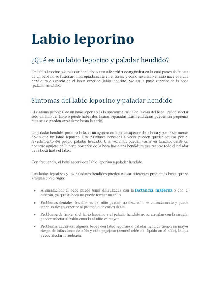 Un labio leporino y/o paladar hendido es una afección congénita en la cual partes de la cara