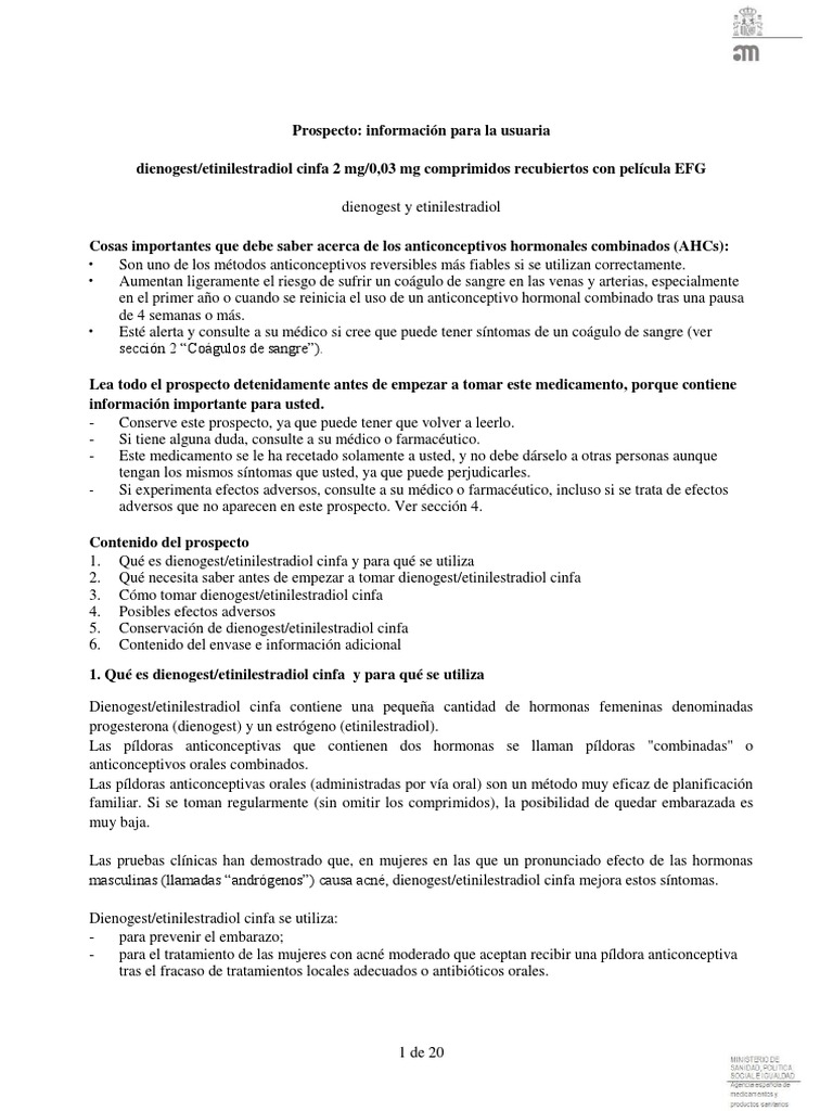 Antes de empezar a usar dienogest/etinilestradiol cinfa debe leer la información acerca de los