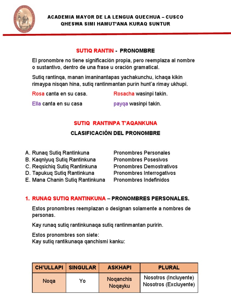 1. RUNAQ SUTIQ RANTINKUNA – PRONOMBRES PERSONALES.
