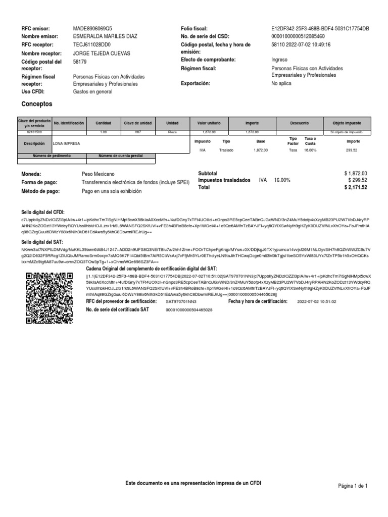RFC del proveedor de certificación: SAT970701NN3 Fecha y hora de certificación: 2022-07-02 [Link]