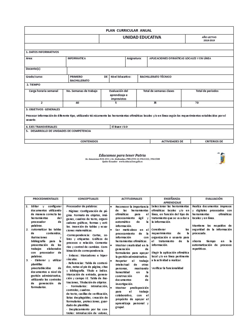 Grado/curso: PRIMERO DE Nivel Educativo: BACHILLERATO TÉCNICO