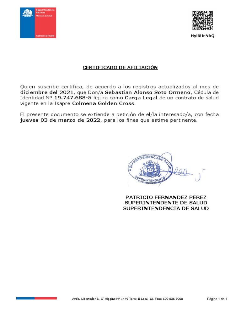 Identidad Nº 19.747.688-5 figura como Carga Legal de un contrato de salud