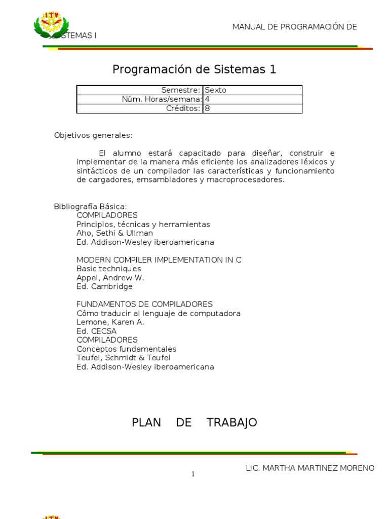 Ubicacin de la materia. A. Ubicacin terica. Se imparte en sexto semestre; sus antecedente son las materias de Lenguajes y Autmatas y Admn. De Archivos. Materias paralelas: ninguna Materias subsecuentes: Programacin de Sistemas II Ubicacin practica. Tipo de Alumnos: diversos; algunos trabajan. Son de clase baja-media-alta, ambos sexos. Grupo: 20 alumnos por grupo promedio. Horario: matutino Recursos: saln austero en todo o con clima, Sala Audiovisual, TV, Video, PC, Proy. De acetatos.
